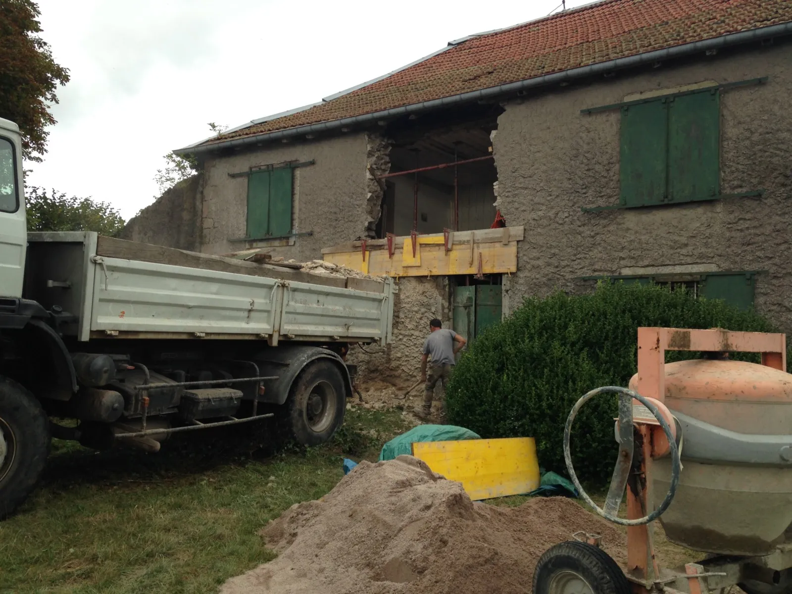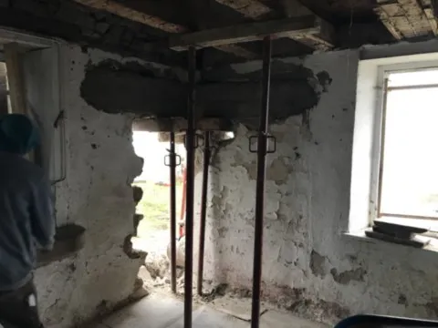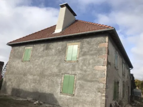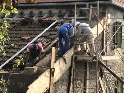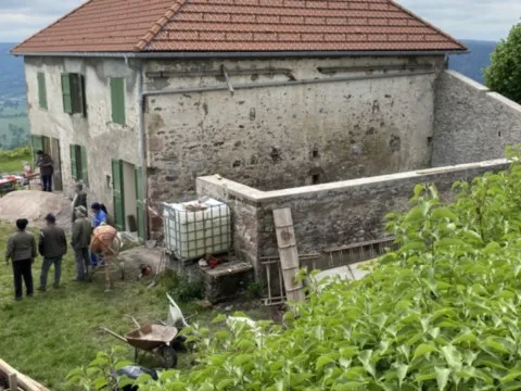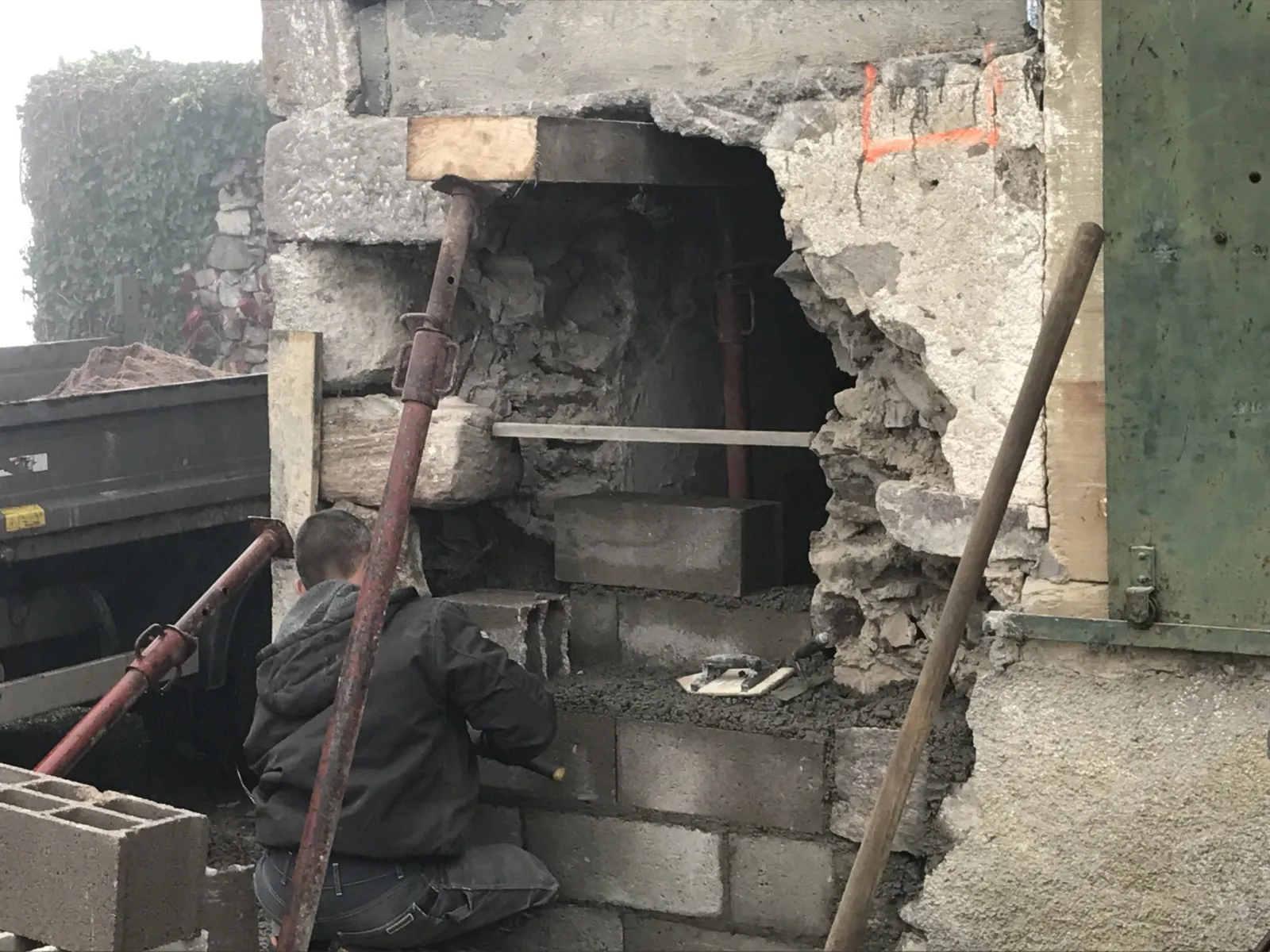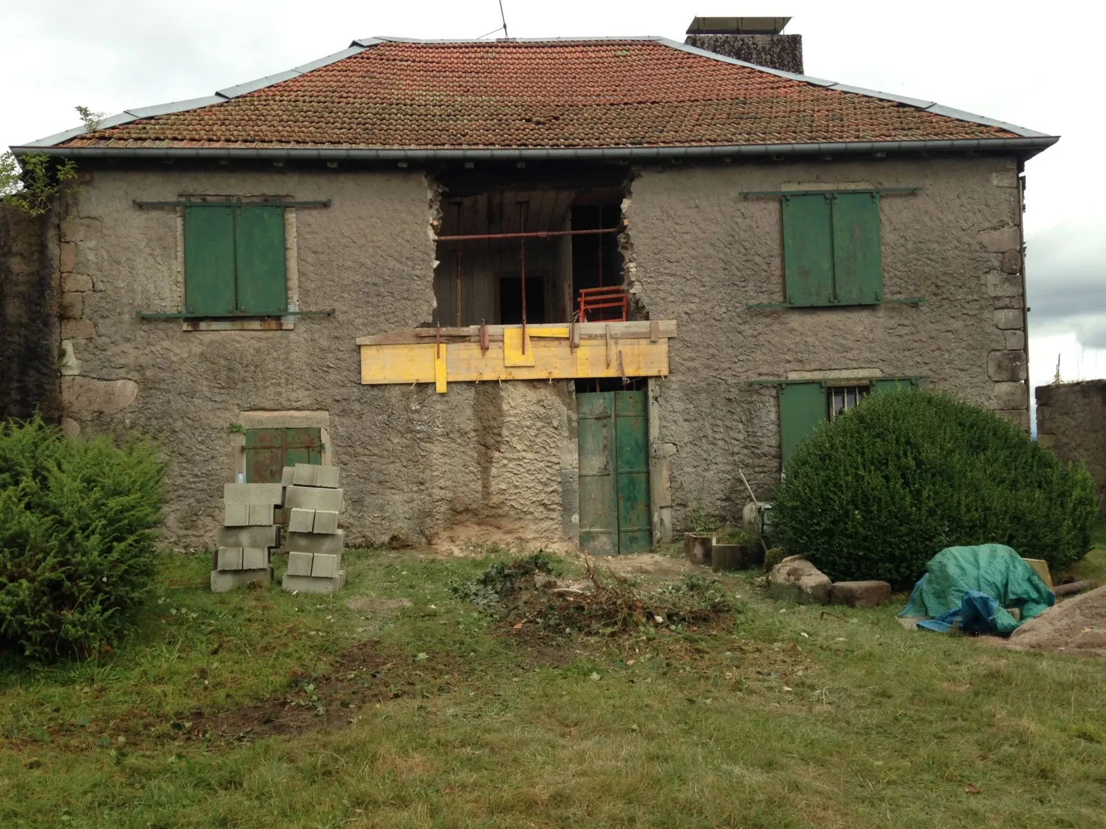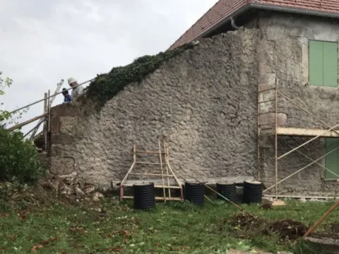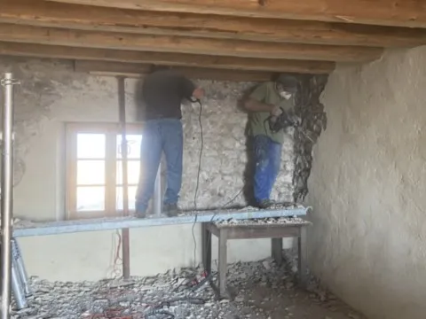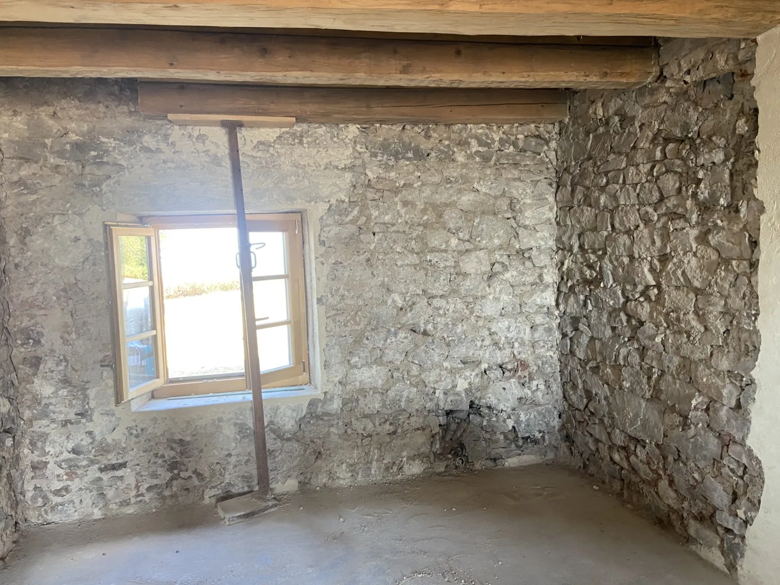 Mai 2018 : Pose d'enduit sur tous les murs des 2 pièces du fond en laissant quelques pierres apparentes. Remplacement des linteaux de portes et fenêtre des 4 pièces en question, dont le bois était obsolète, en coulant du béton avec le ferraillage approprié. Nous rebouchons tous les trous de poutres et égalisons le dessus d'un mur de refend sur lequel se pose le poutrage du 2ème étage.