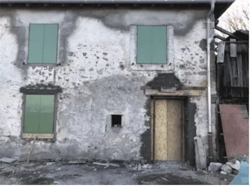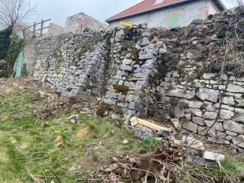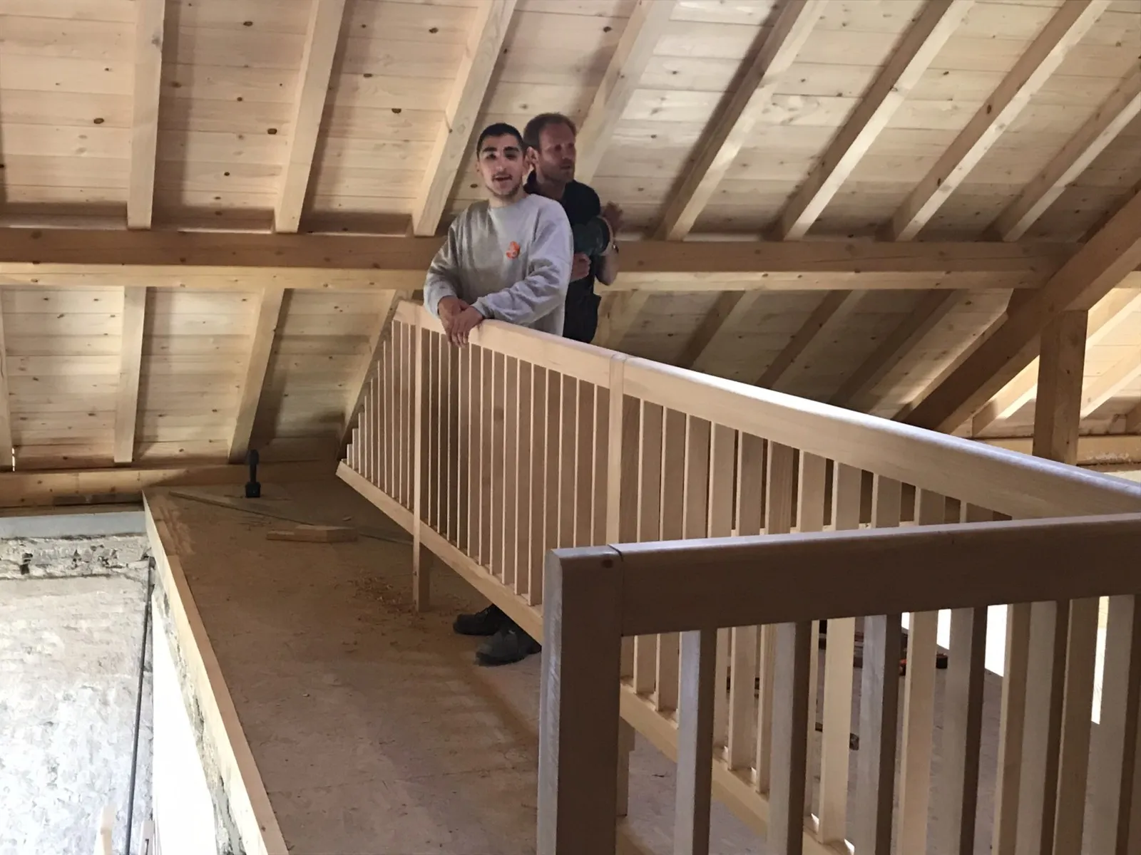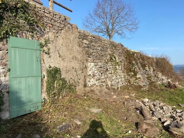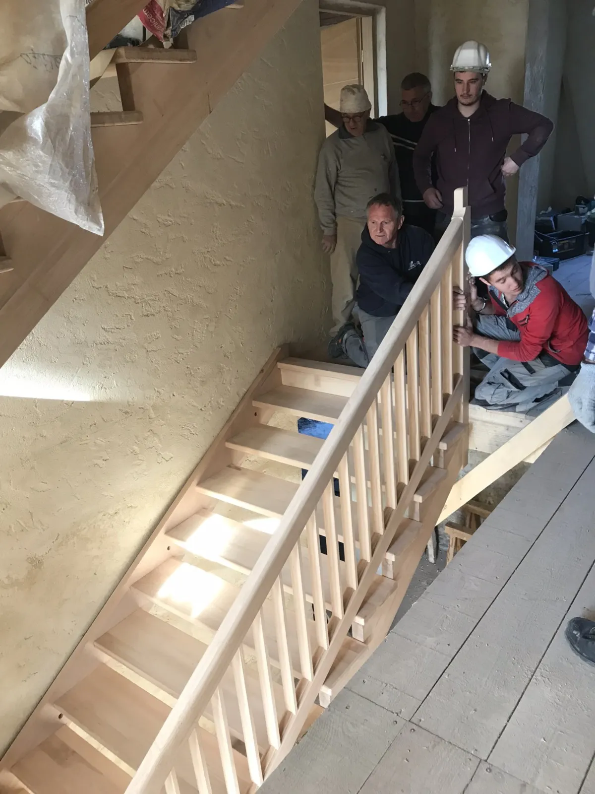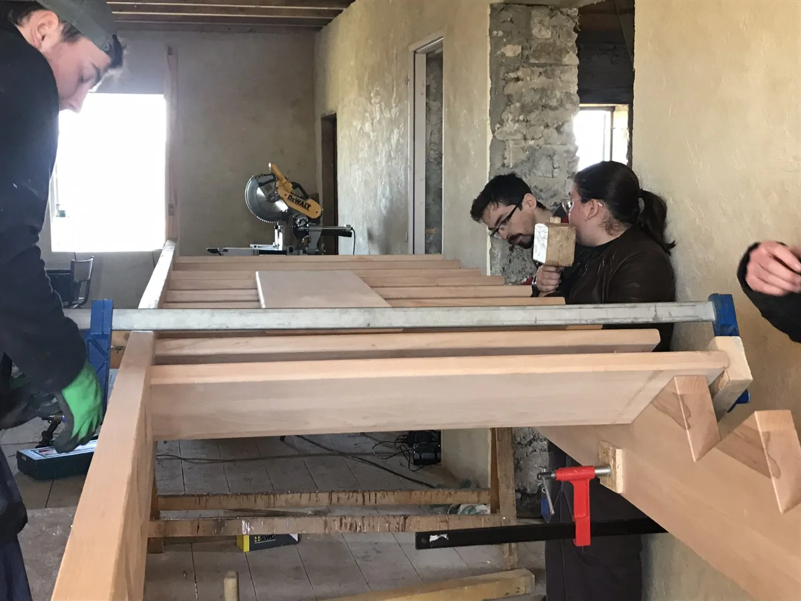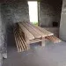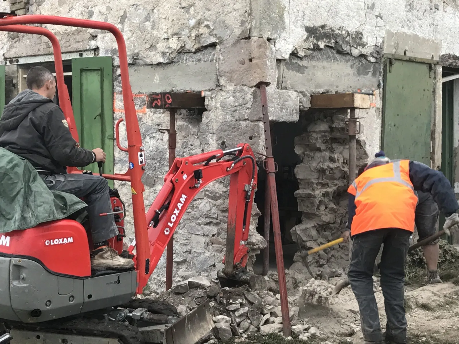 Mai 2018 : Pose d'enduit sur tous les murs des 2 pièces du fond en laissant quelques pierres apparentes. Remplacement des linteaux de portes et fenêtre des 4 pièces en question, dont le bois était obsolète, en coulant du béton avec le ferraillage approprié. Nous rebouchons tous les trous de poutres et égalisons le dessus d'un mur de refend sur lequel se pose le poutrage du 2ème étage.