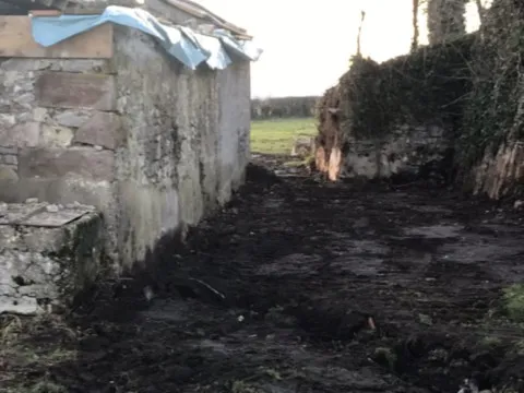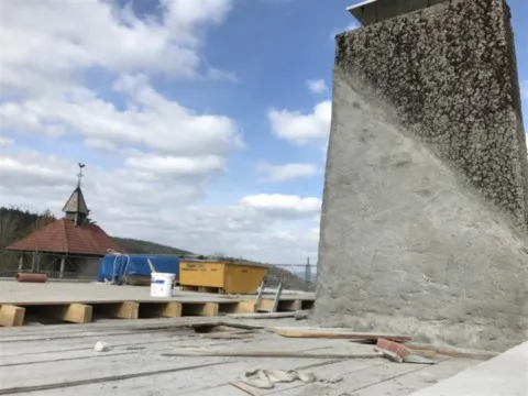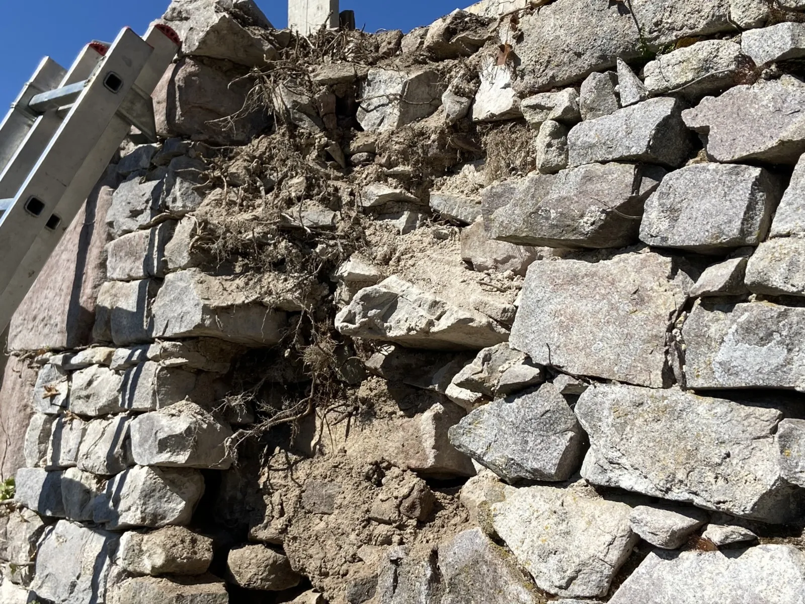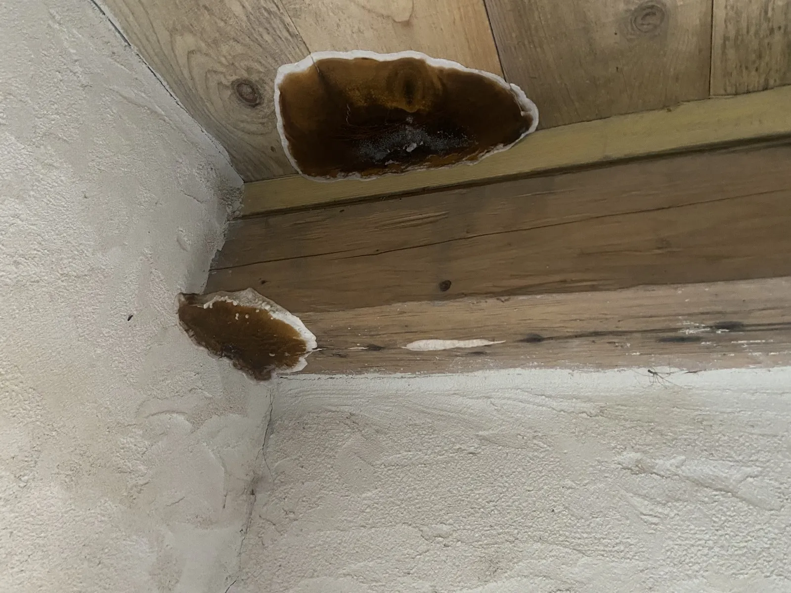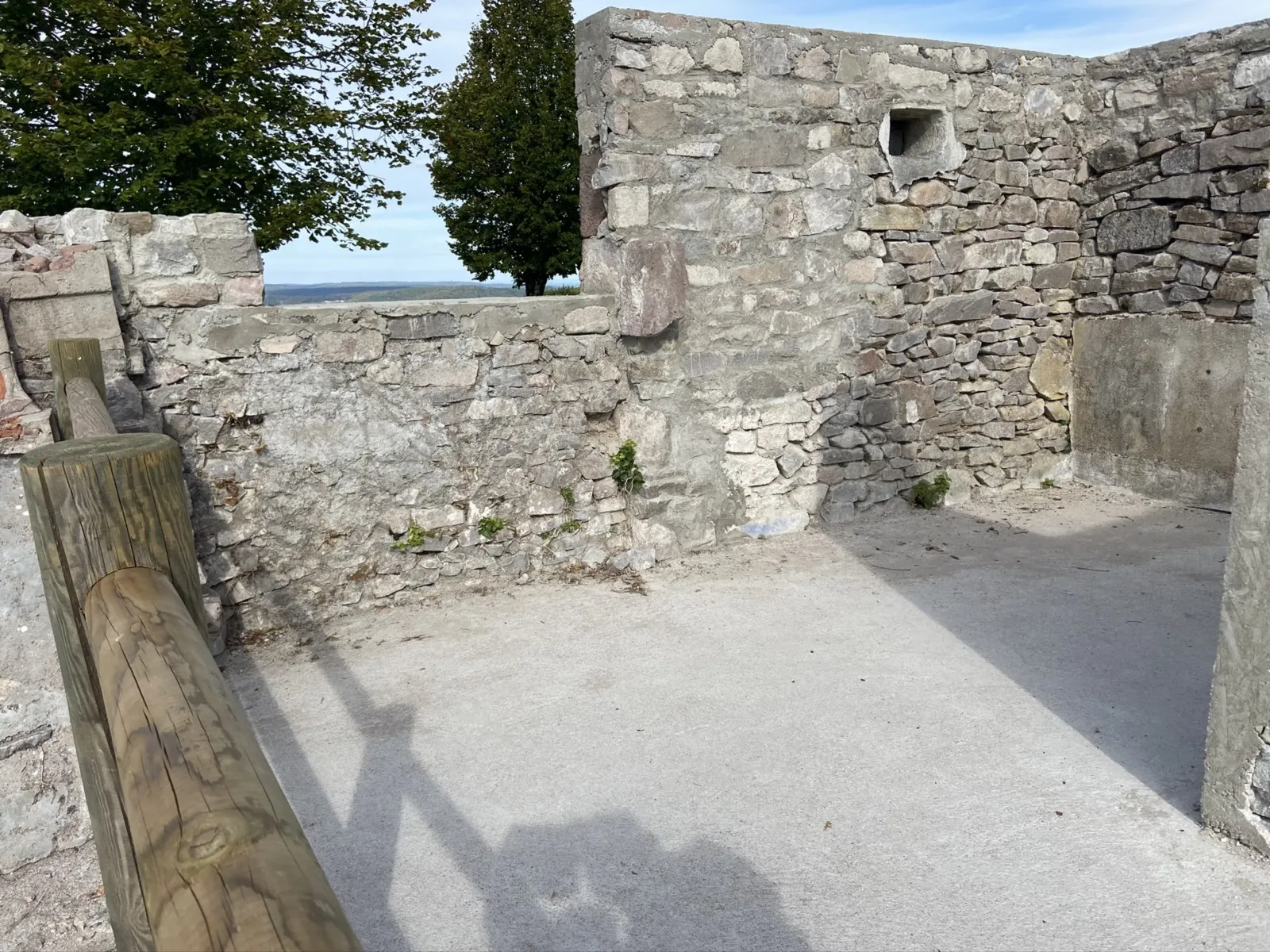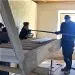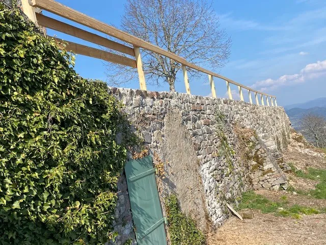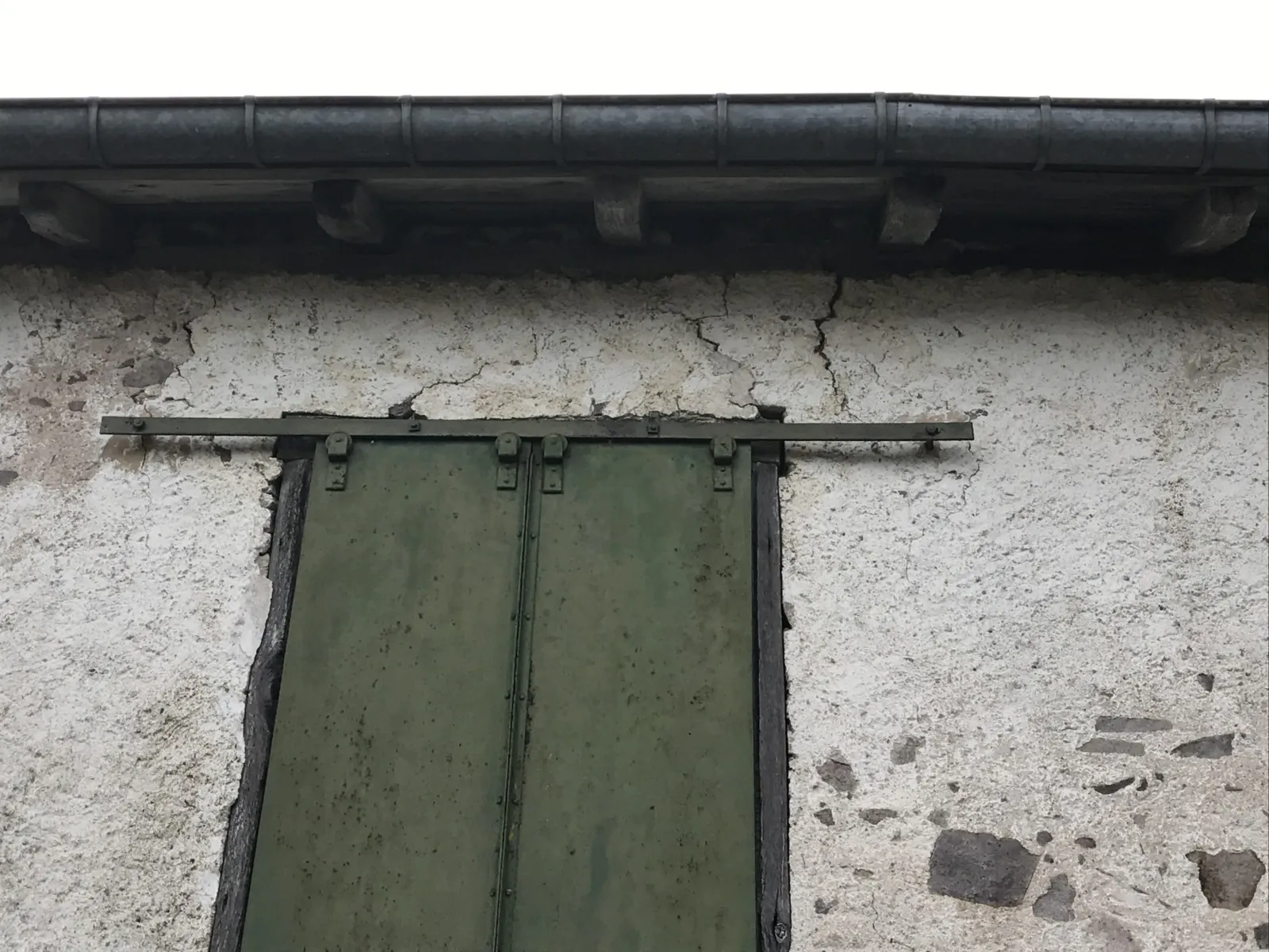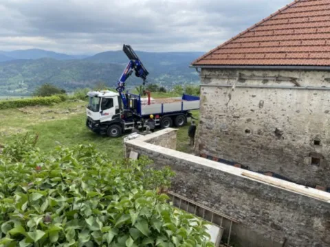 Mai 2018 : Pose d'enduit sur tous les murs des 2 pièces du fond en laissant quelques pierres apparentes. Remplacement des linteaux de portes et fenêtre des 4 pièces en question, dont le bois était obsolète, en coulant du béton avec le ferraillage approprié. Nous rebouchons tous les trous de poutres et égalisons le dessus d'un mur de refend sur lequel se pose le poutrage du 2ème étage.