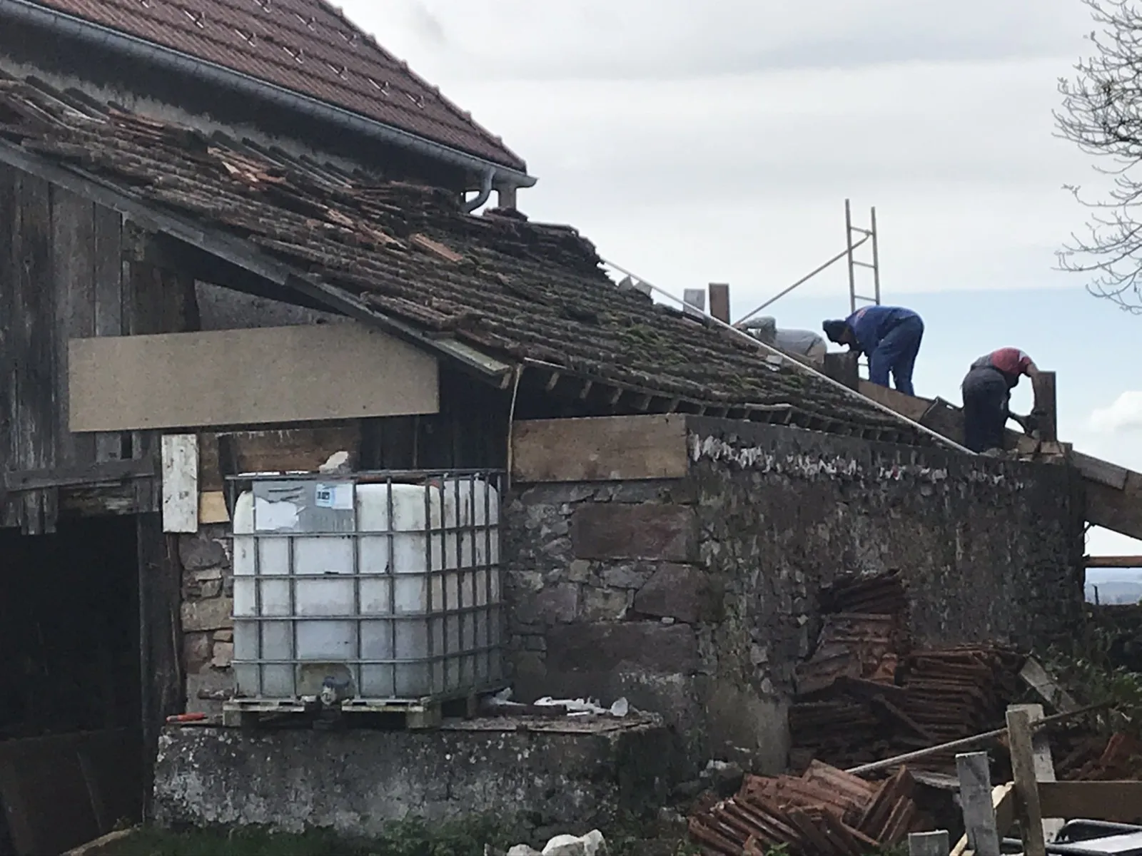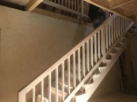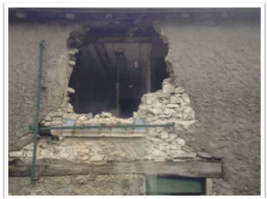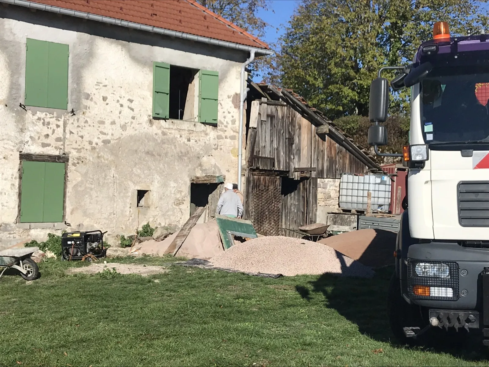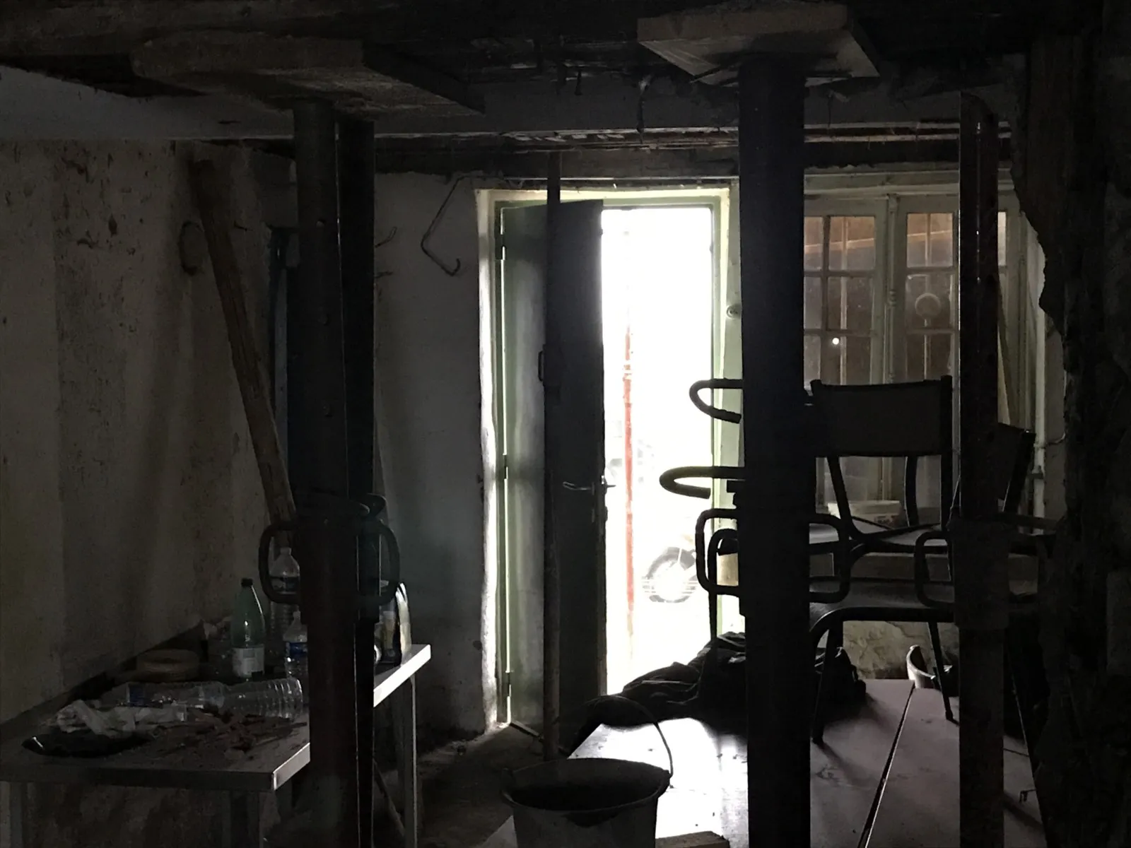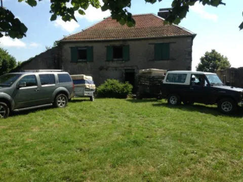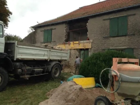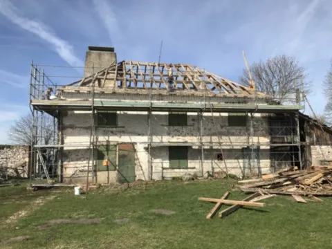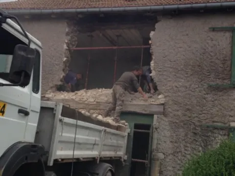 Avril 2018 : Redémarrage des travaux pour l'aménagement de l'intérieur de la maison en commençant par la cuisine, la salle à manger et les 2 pièces au-dessus. Cela commence par le décrépissage complet de tous les murs, l’enlèvement du plancher et du plafond du 1°étage et ensuite le changement des poutres du plafond de la cuisine et le remplacement de 2 poutres à la salle à manger.