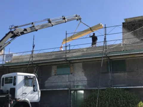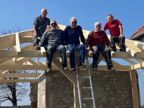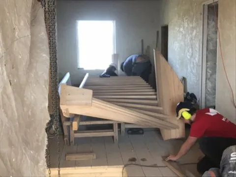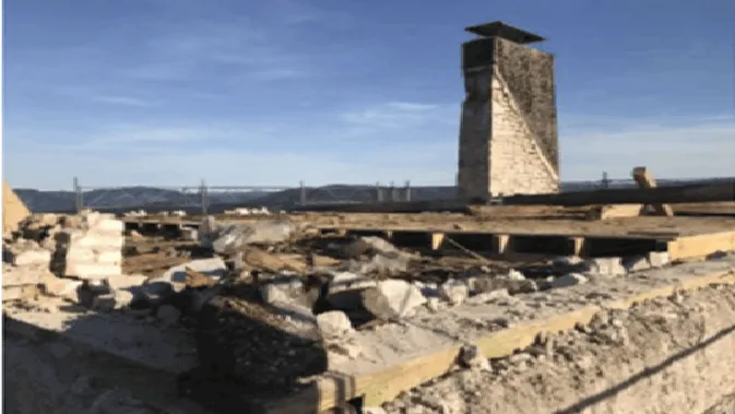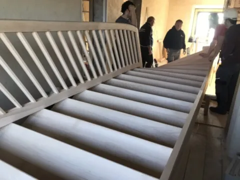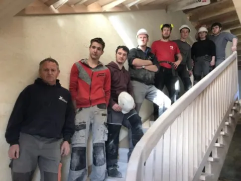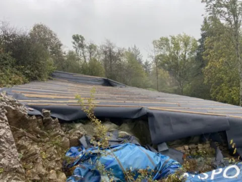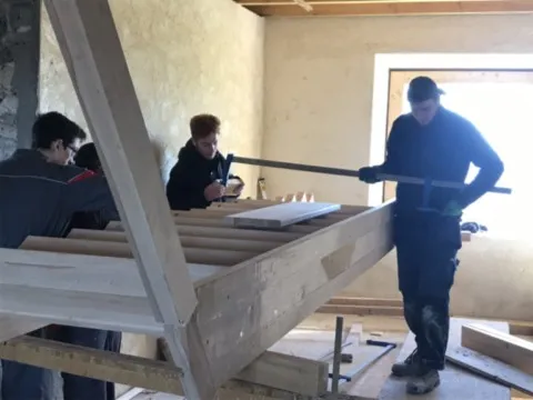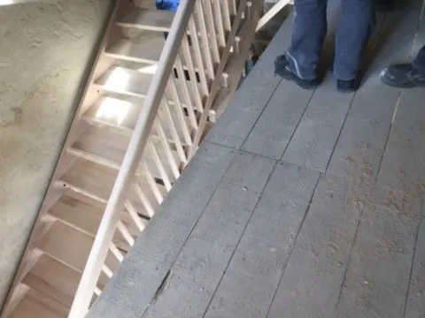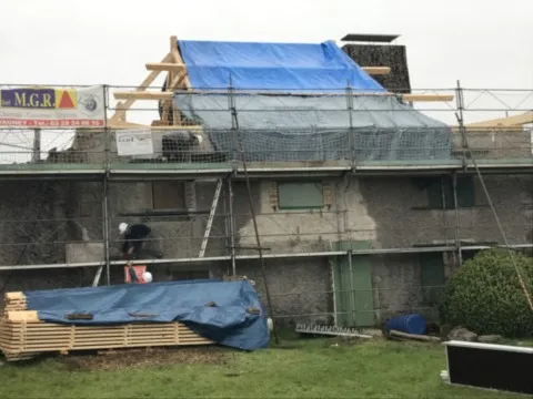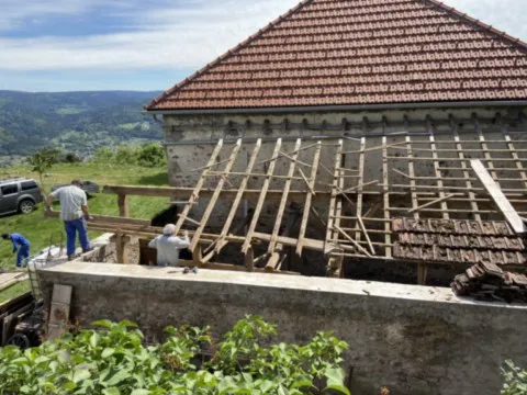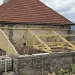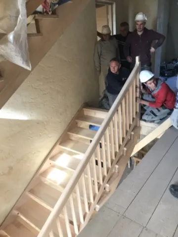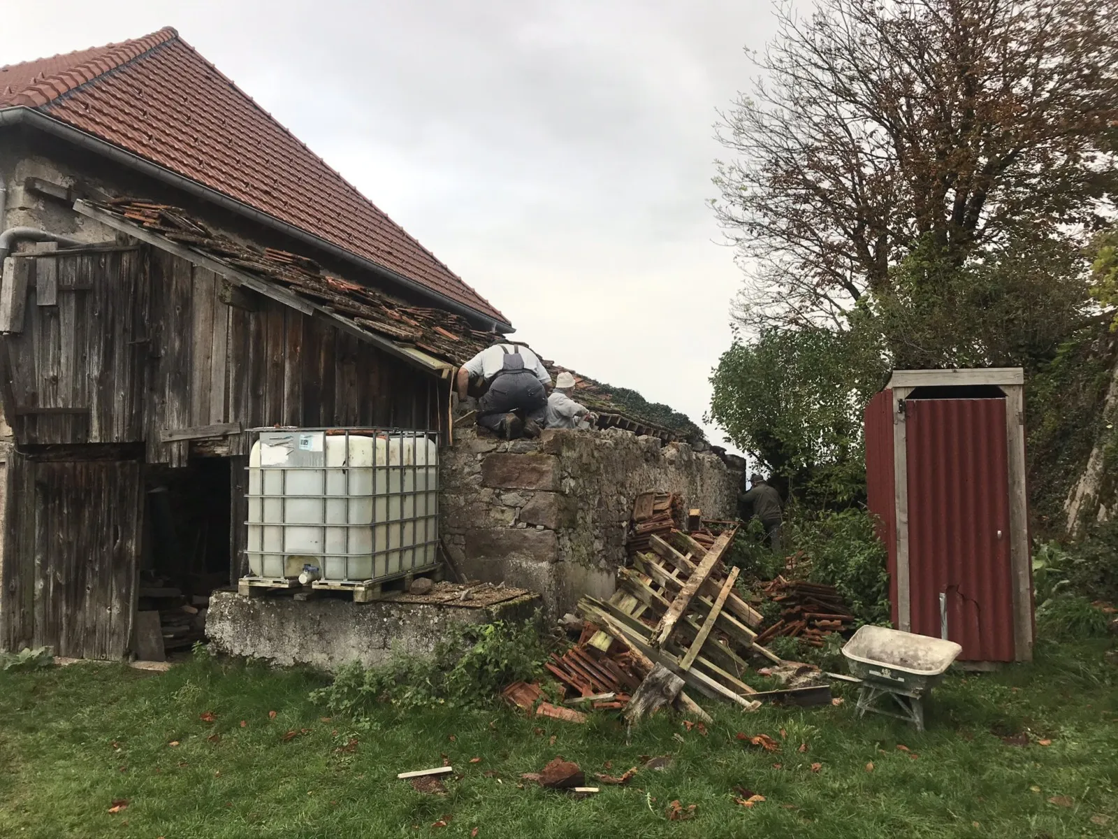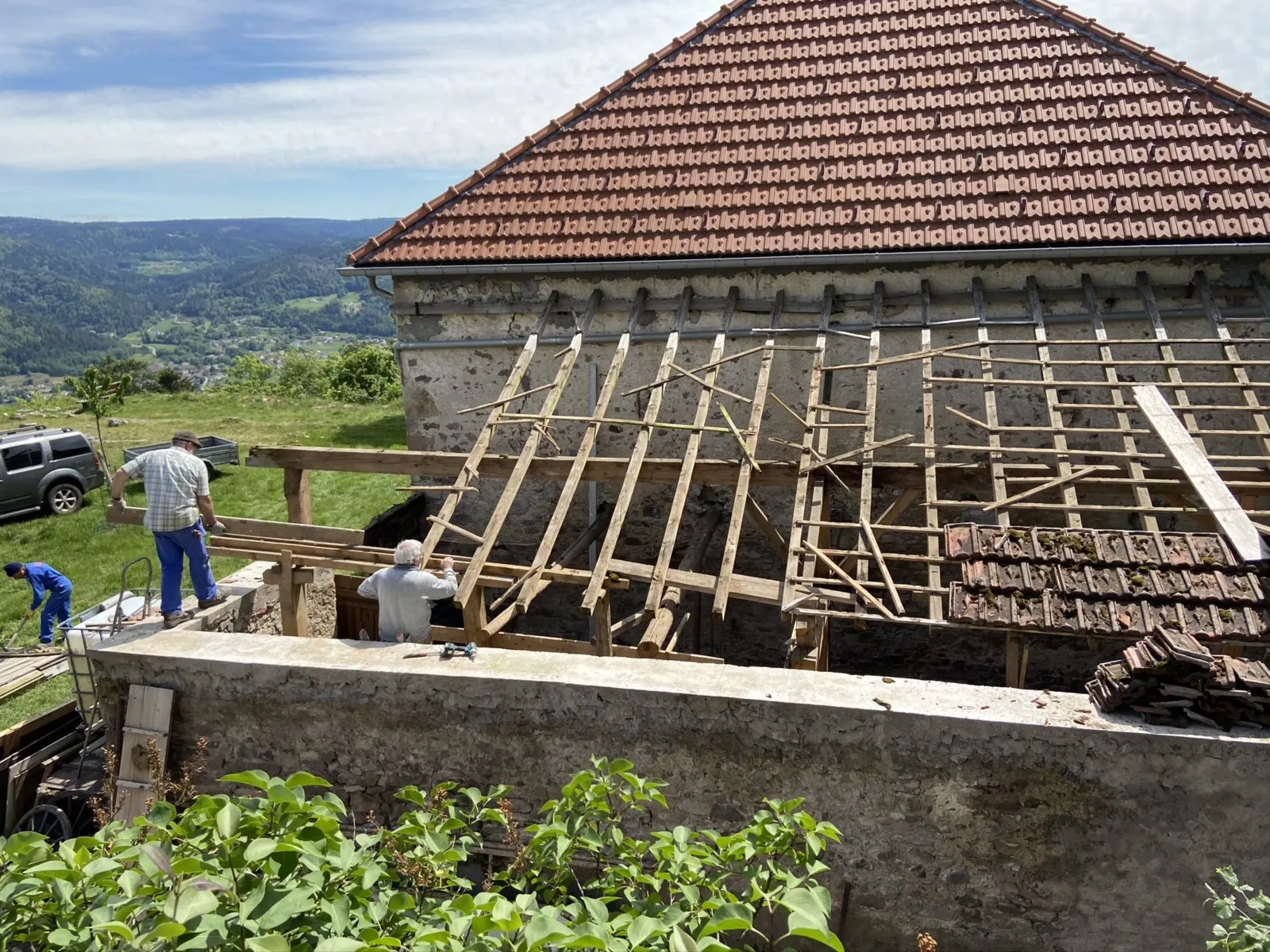 Avril 2018 : Redémarrage des travaux pour l'aménagement de l'intérieur de la maison en commençant par la cuisine, la salle à manger et les 2 pièces au-dessus. Cela commence par le décrépissage complet de tous les murs, l’enlèvement du plancher et du plafond du 1°étage et ensuite le changement des poutres du plafond de la cuisine et le remplacement de 2 poutres à la salle à manger.