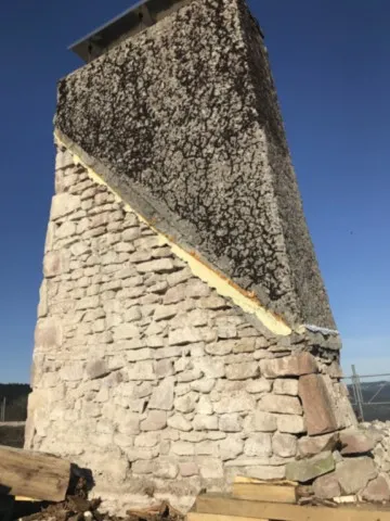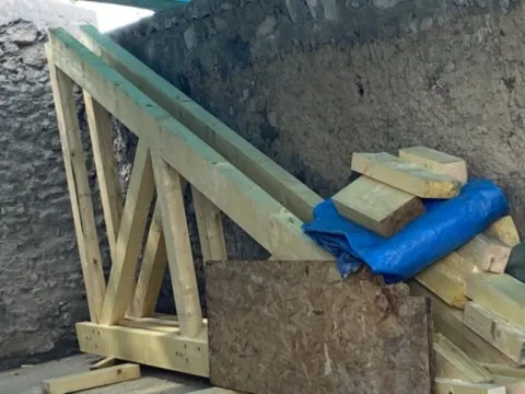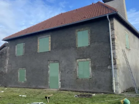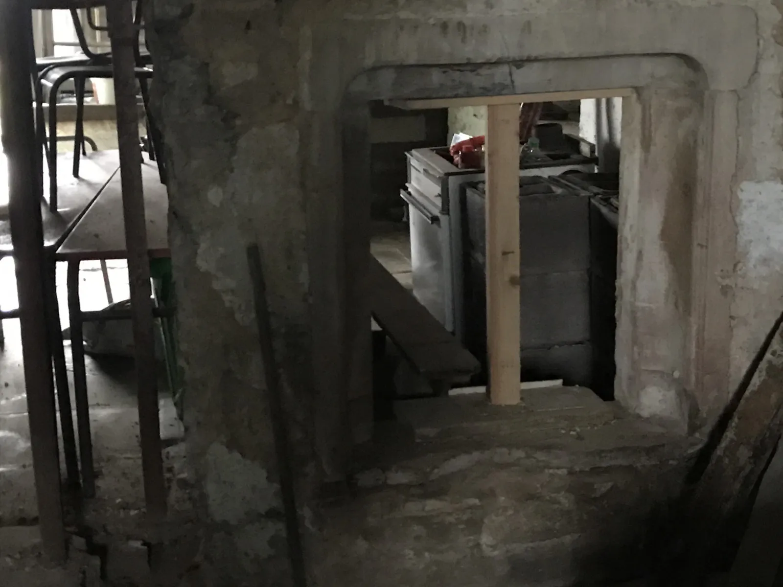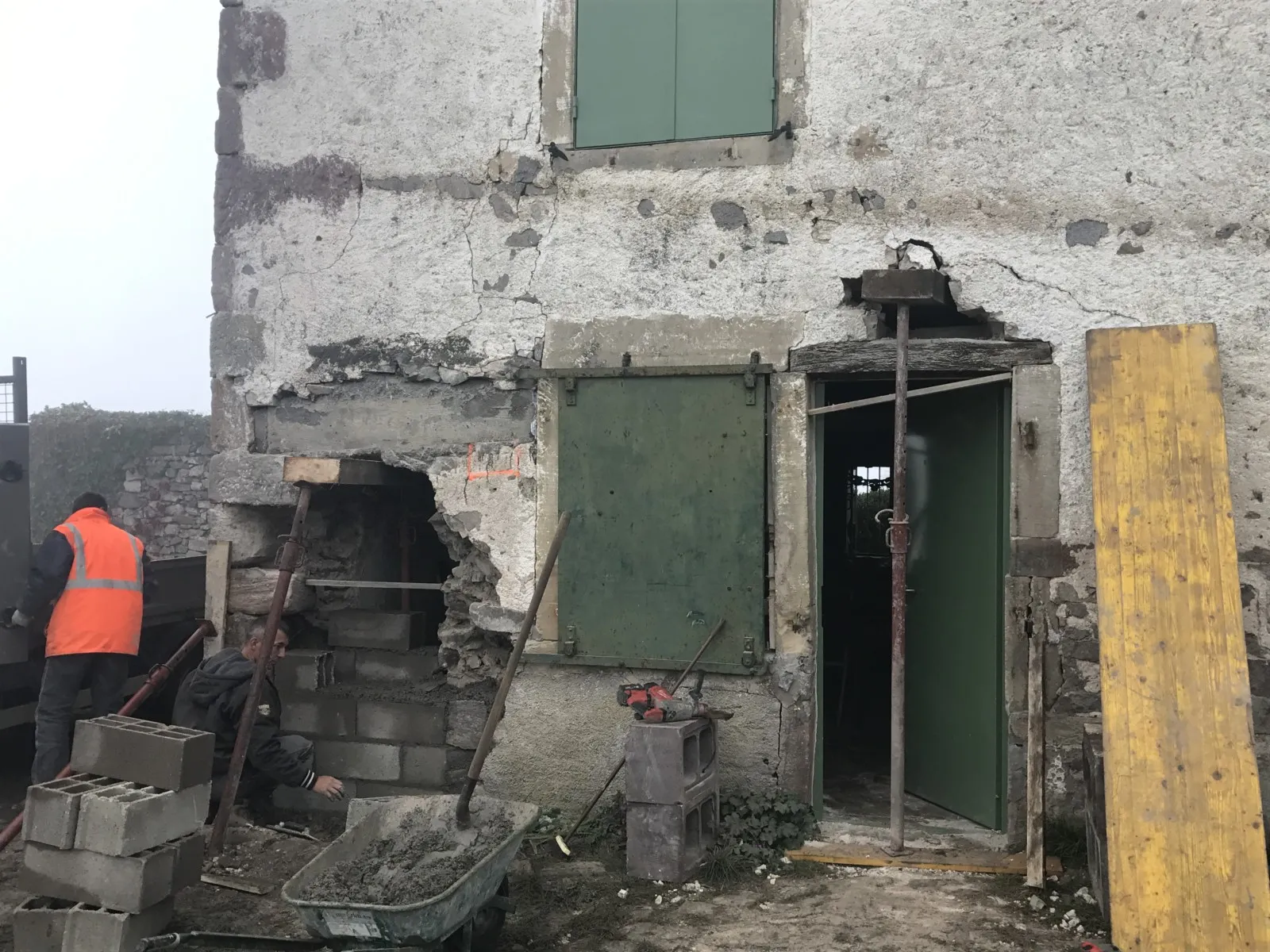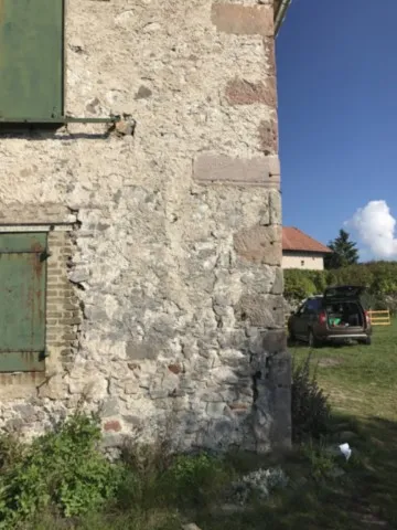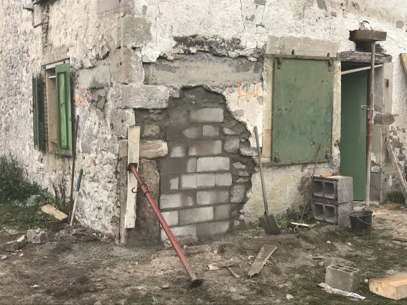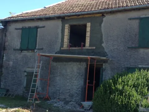 Mai 2018 : Pose d'enduit sur tous les murs des 2 pièces du fond en laissant quelques pierres apparentes. Remplacement des linteaux de portes et fenêtre des 4 pièces en question, dont le bois était obsolète, en coulant du béton avec le ferraillage approprié. Nous rebouchons tous les trous de poutres et égalisons le dessus d'un mur de refend sur lequel se pose le poutrage du 2ème étage.
