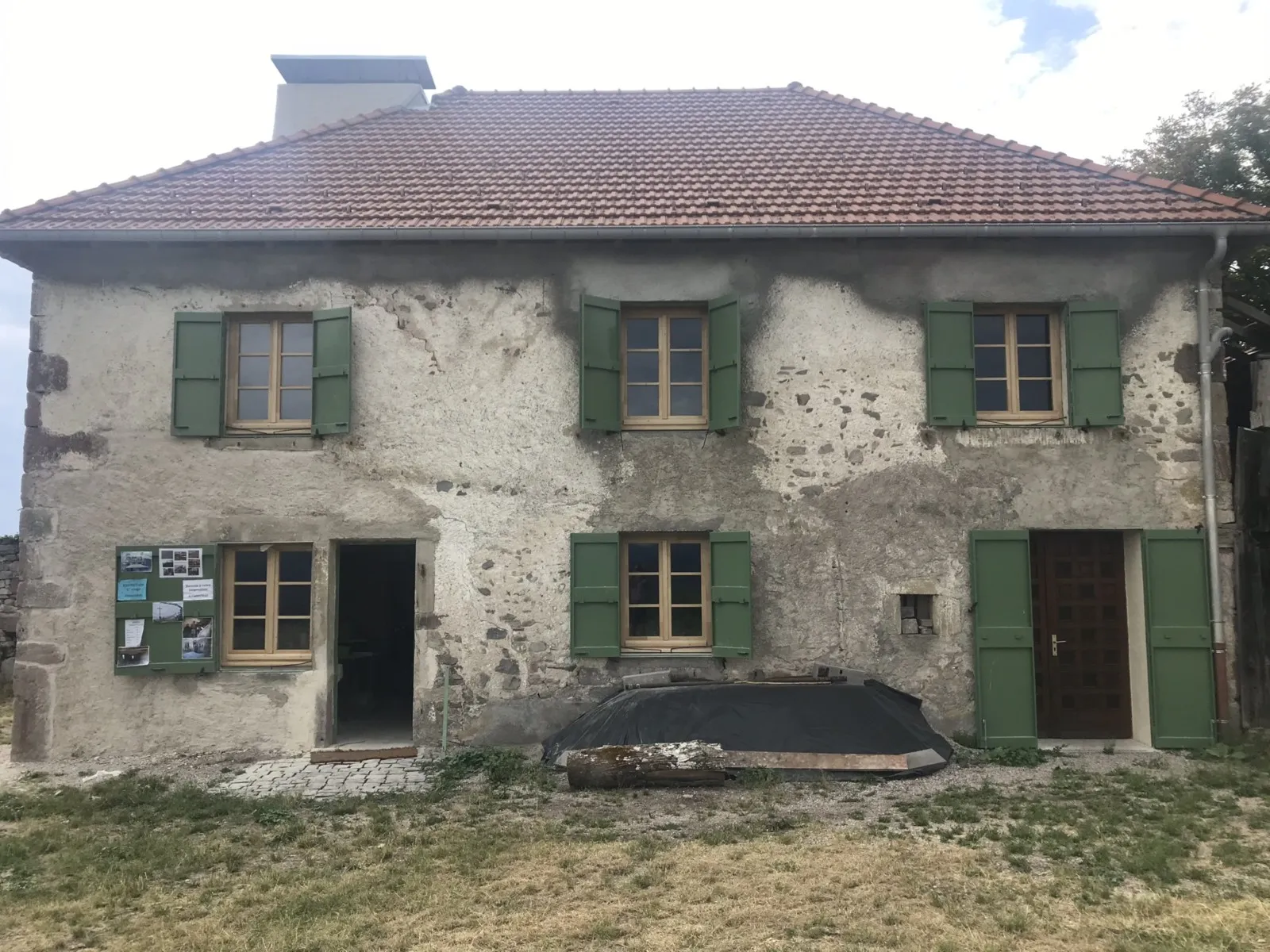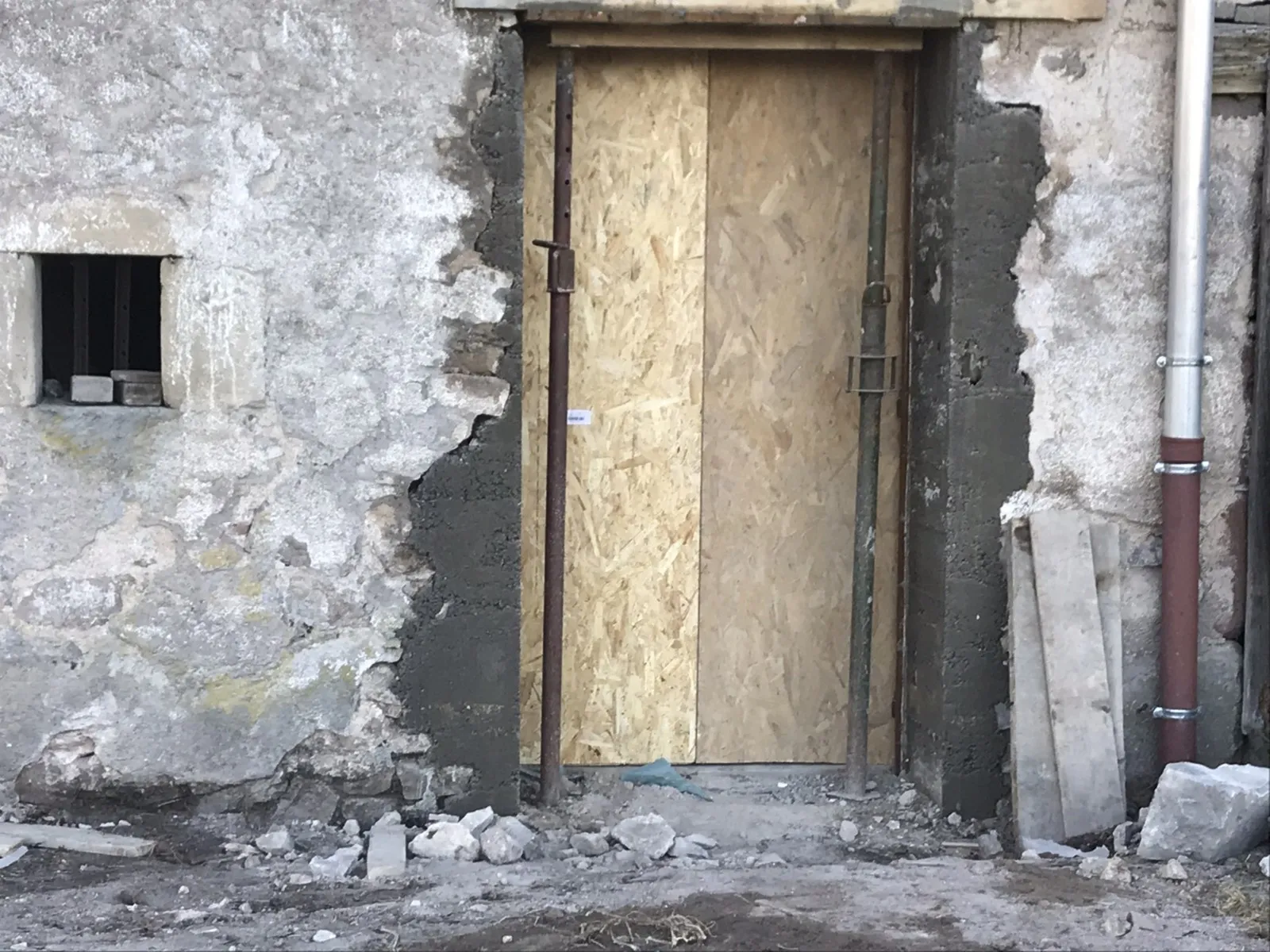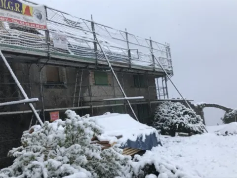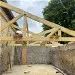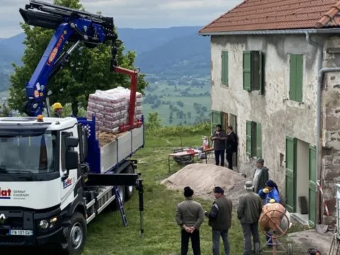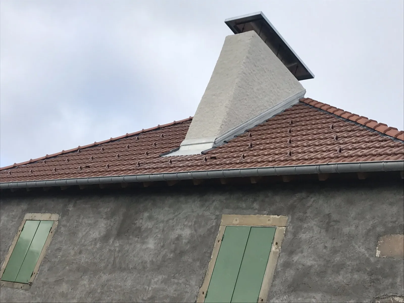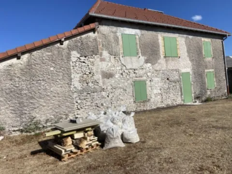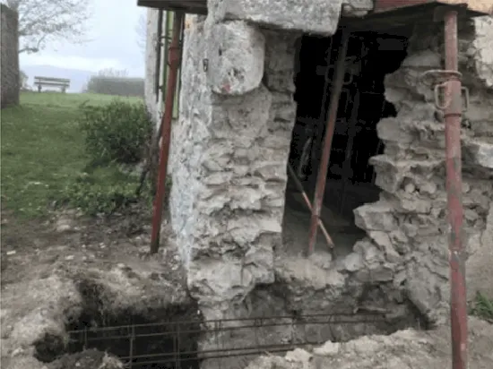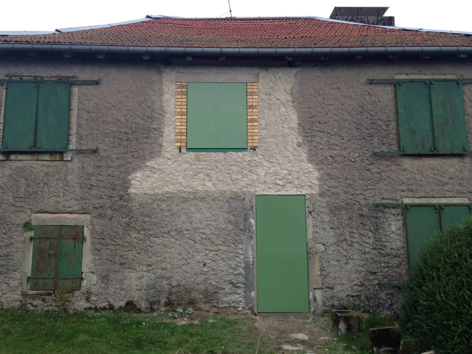 Mai 2018 : Pose d'enduit sur tous les murs des 2 pièces du fond en laissant quelques pierres apparentes. Remplacement des linteaux de portes et fenêtre des 4 pièces en question, dont le bois était obsolète, en coulant du béton avec le ferraillage approprié. Nous rebouchons tous les trous de poutres et égalisons le dessus d'un mur de refend sur lequel se pose le poutrage du 2ème étage.