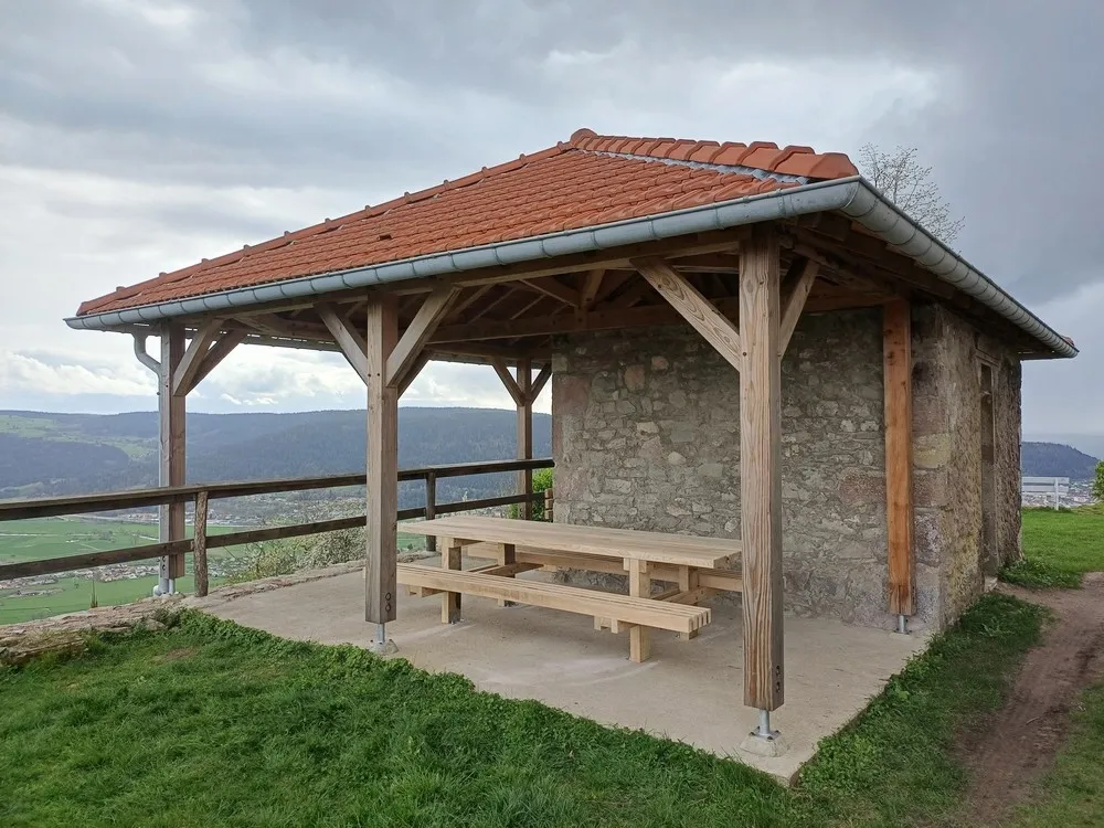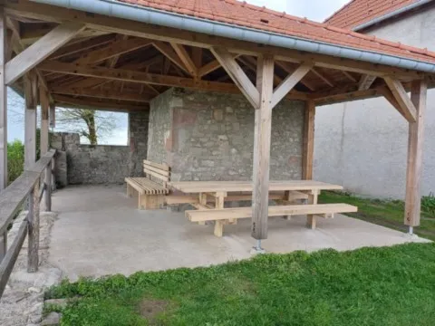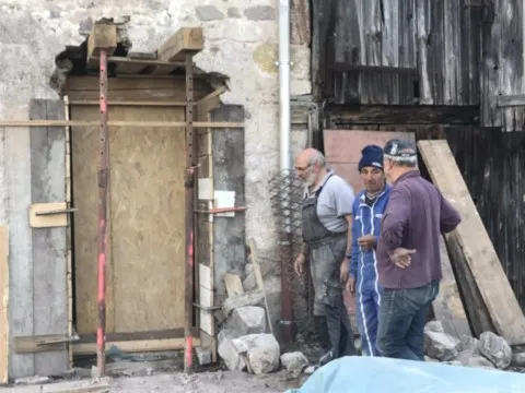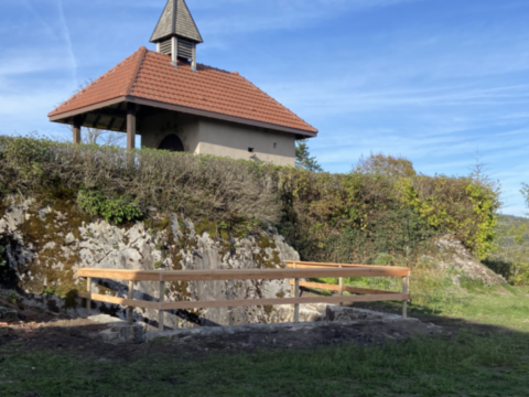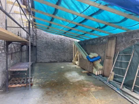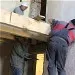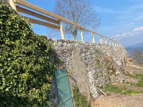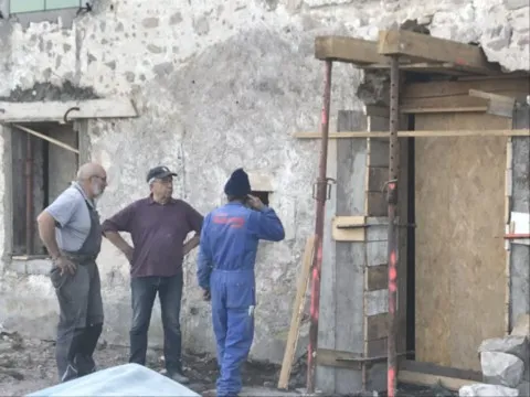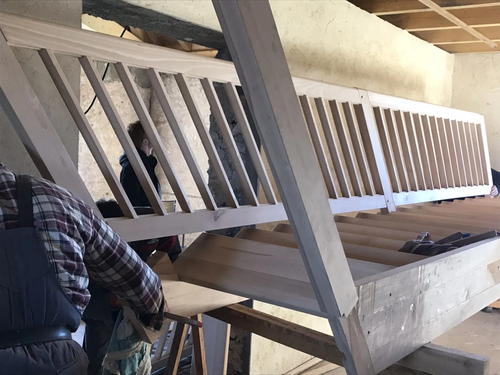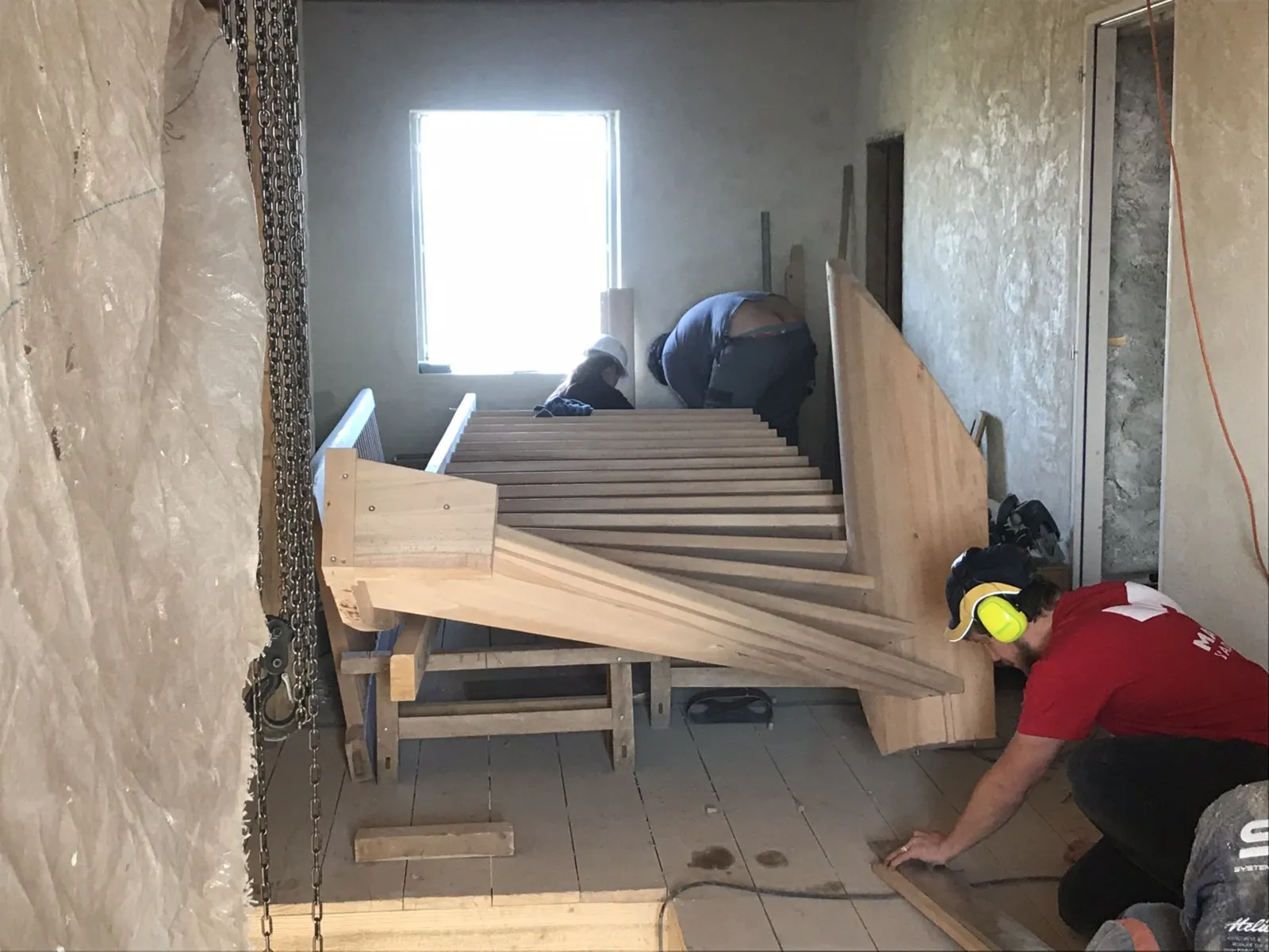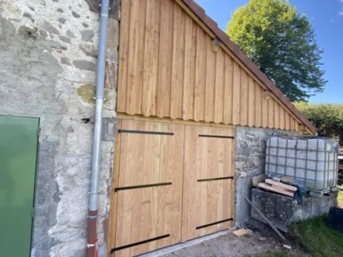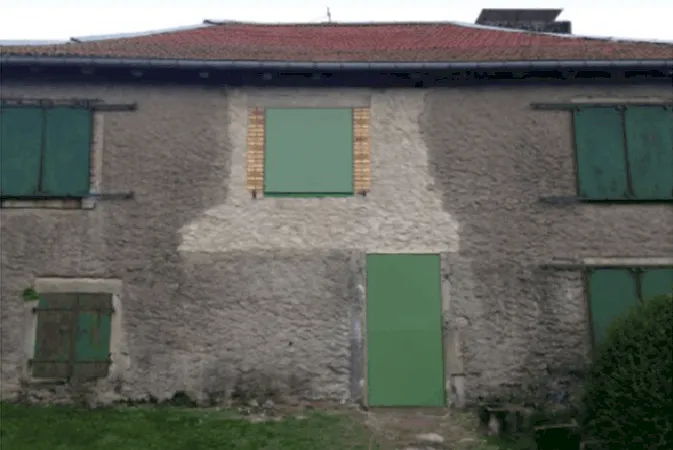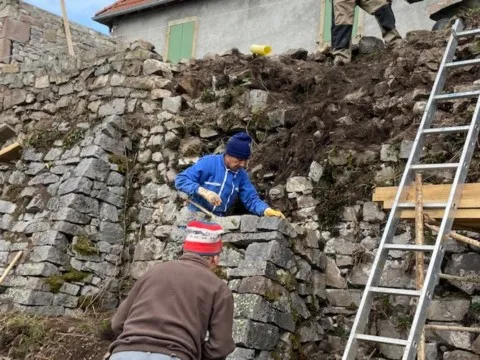 Mai 2018 : Pose d'enduit sur tous les murs des 2 pièces du fond en laissant quelques pierres apparentes. Remplacement des linteaux de portes et fenêtre des 4 pièces en question, dont le bois était obsolète, en coulant du béton avec le ferraillage approprié. Nous rebouchons tous les trous de poutres et égalisons le dessus d'un mur de refend sur lequel se pose le poutrage du 2ème étage.