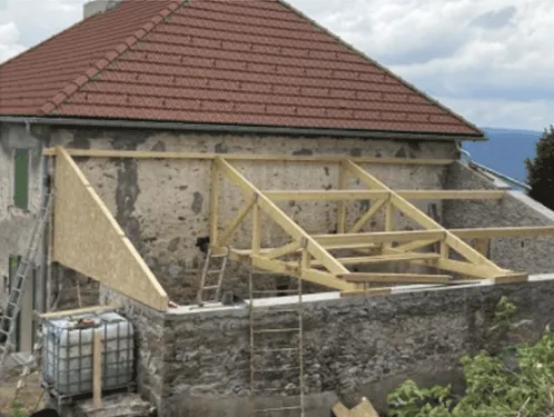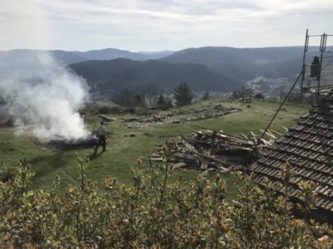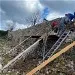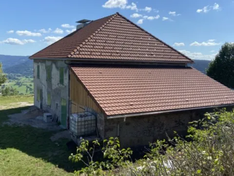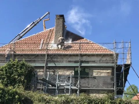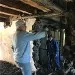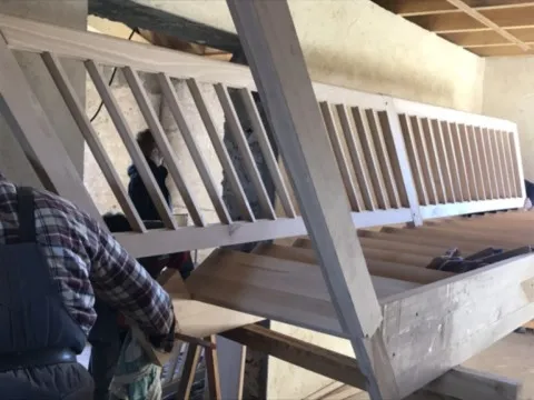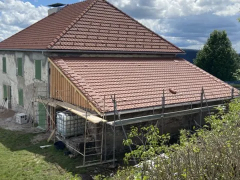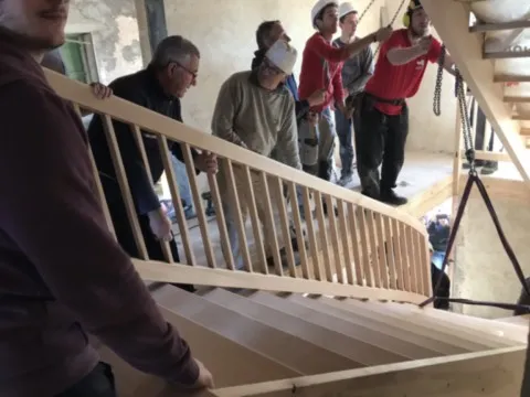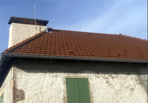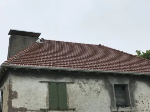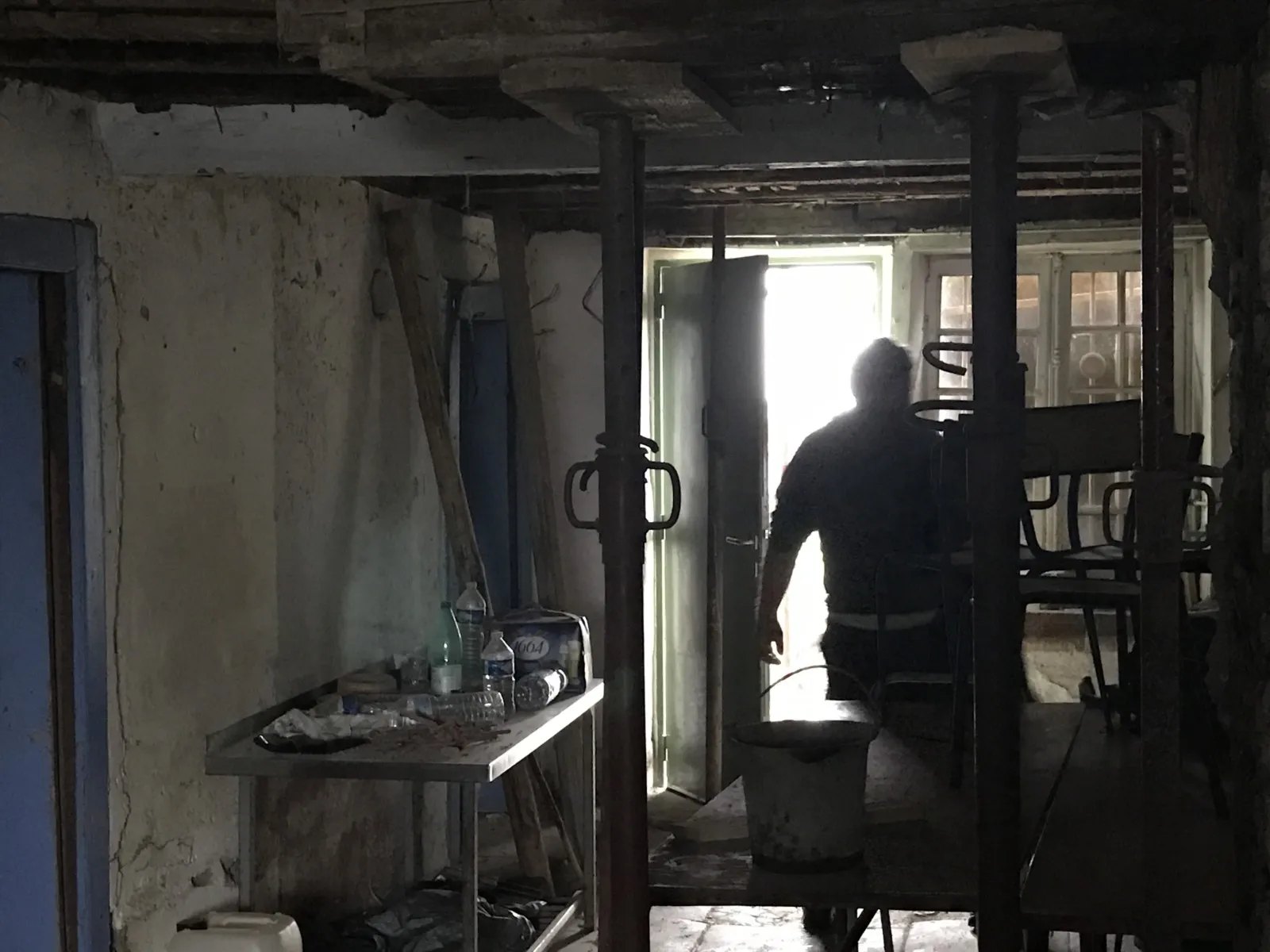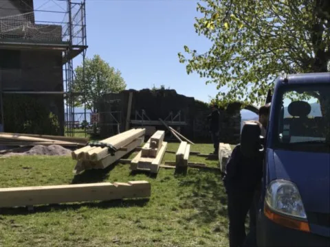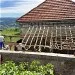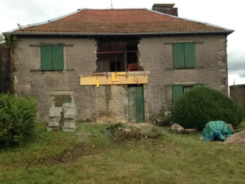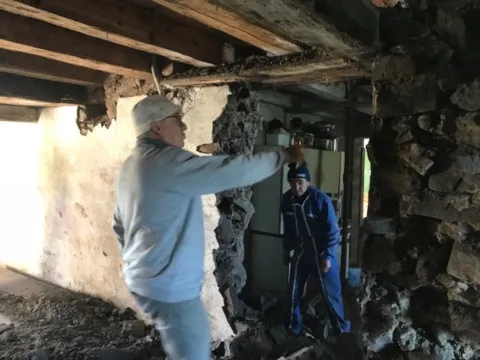 Avril 2018 : Redémarrage des travaux pour l'aménagement de l'intérieur de la maison en commençant par la cuisine, la salle à manger et les 2 pièces au-dessus. Cela commence par le décrépissage complet de tous les murs, l’enlèvement du plancher et du plafond du 1°étage et ensuite le changement des poutres du plafond de la cuisine et le remplacement de 2 poutres à la salle à manger.