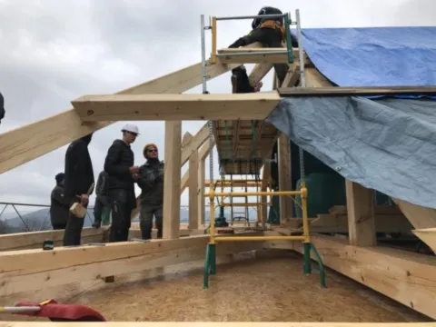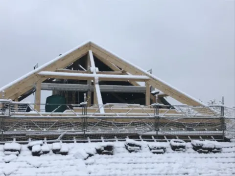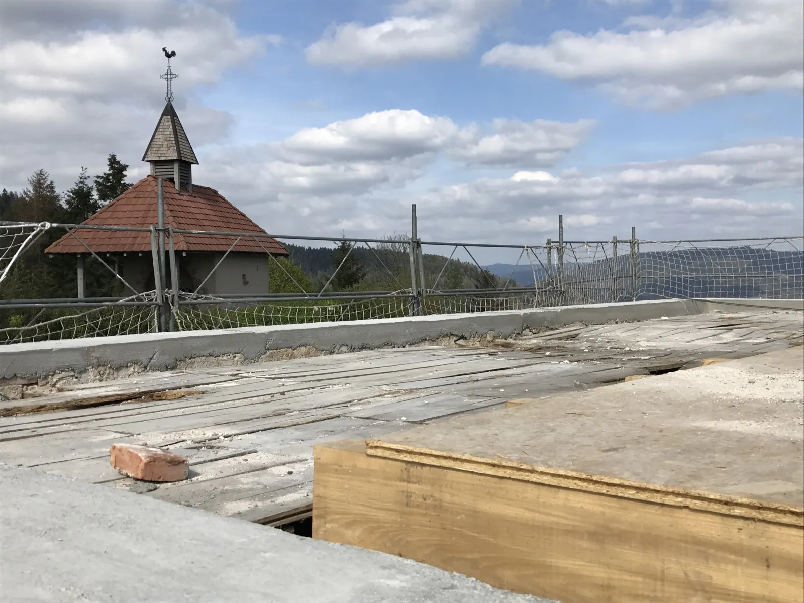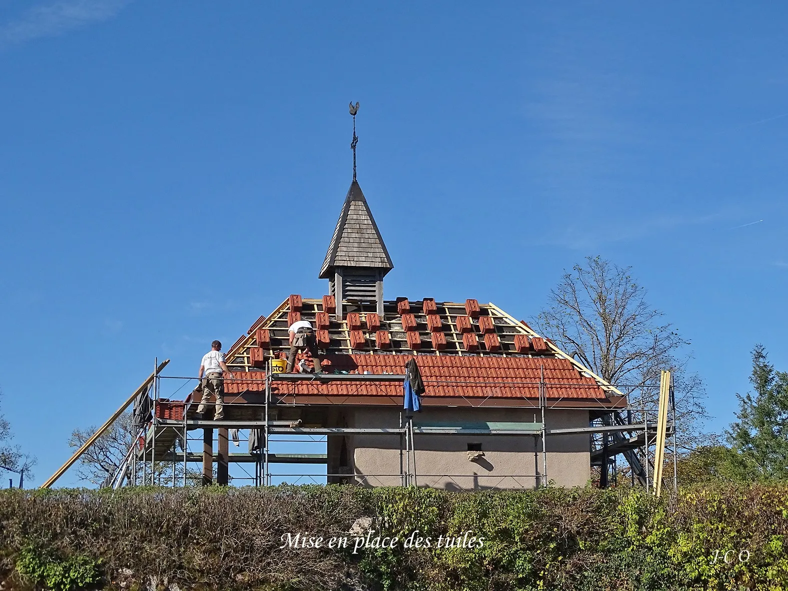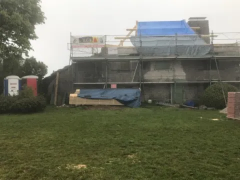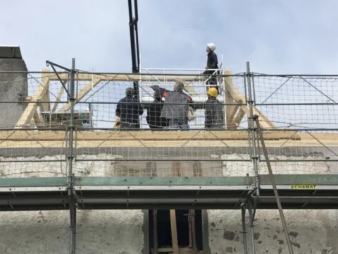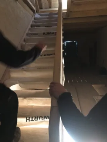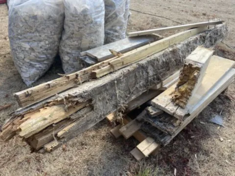 Avril 2018 : Redémarrage des travaux pour l'aménagement de l'intérieur de la maison en commençant par la cuisine, la salle à manger et les 2 pièces au-dessus. Cela commence par le décrépissage complet de tous les murs, l’enlèvement du plancher et du plafond du 1°étage et ensuite le changement des poutres du plafond de la cuisine et le remplacement de 2 poutres à la salle à manger.